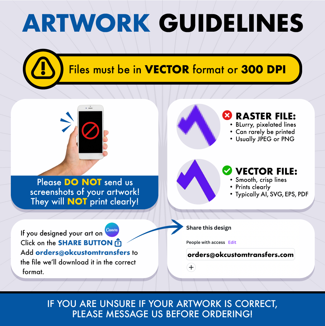 It is very important to start off right when it comes to building your gang sheets. Having a low-resolution image or a picture of a picture is not going to yield a quality print. Do you want the best print? Vector art is the way to go! The next best thing is making sure you have an image that is 300 dpi. If you need assistance or have a question, you can always email us at orders@okcustomtransfers.com.